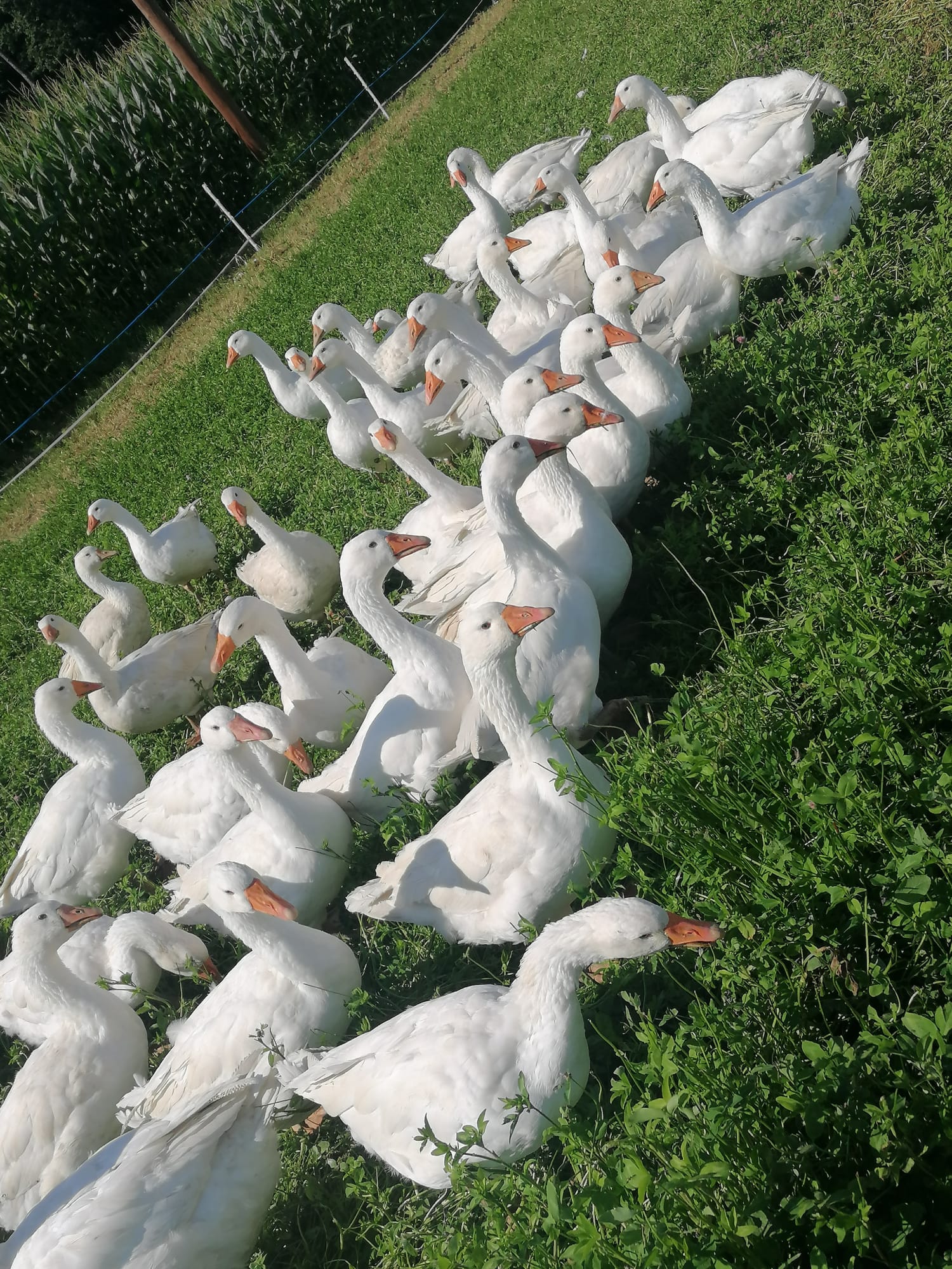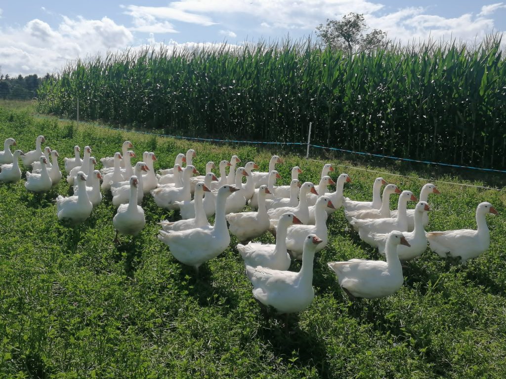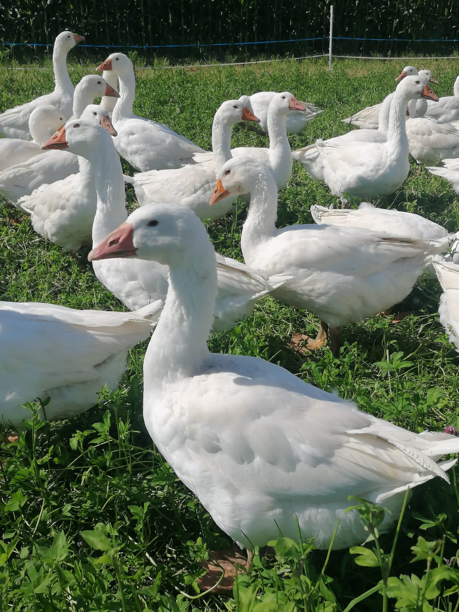 Unsere Weidegänse genießen seit Anfang Juni ein Leben inmitten der Natur. Große Weideflächen bieten unseren Tieren genügend Platz, um sich frei zu bewegen und frische Luft zu schnappen. Unsere Weidegänse werden ausschließlich mit natürlichen Futtermitteln gefüttert. Das bedeutet, dass sie sich von frischem Gras, Getreide und gesunden Pflanzen ernähren. All das macht das Fleisch unserer Weidegänse besonders schmackhaft, kompakt und relativ fettarm.